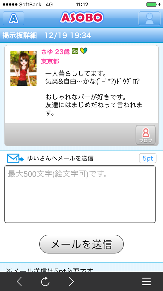 男性にメールを送信する 1pt 女性にメールを送信する 5pt マル秘データを見る 2pt サークルの利用料 20pt |