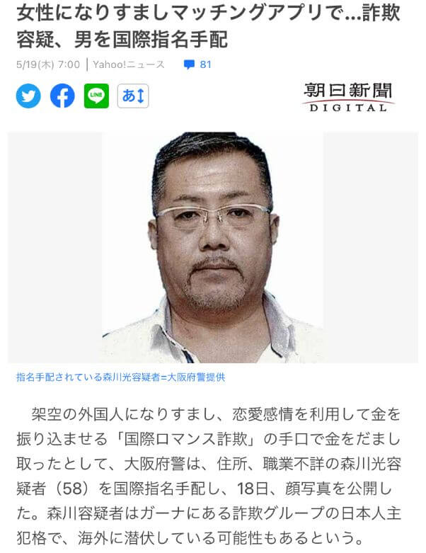 海外に拠点をおく詐欺グループが架空の女性アカウントを使って男性からお金をだまし取ったとされ、その日本人主犯格の男性がアフリカで逮捕されています。