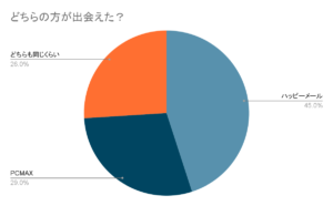 どちらの方が出会えた?という質問では、ハッピーメールが優位でした。ただ、同じくらいと回答している人も一定割合でいるようです。