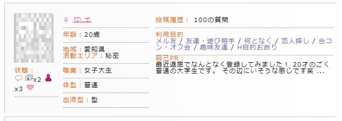 利用目的は「メル友」「友達・遊び相手」「趣味友達」などに設定していることが多く、同じ趣味を持った人や暇な時に遊べる相手を募集している書き込み内容が特徴です。