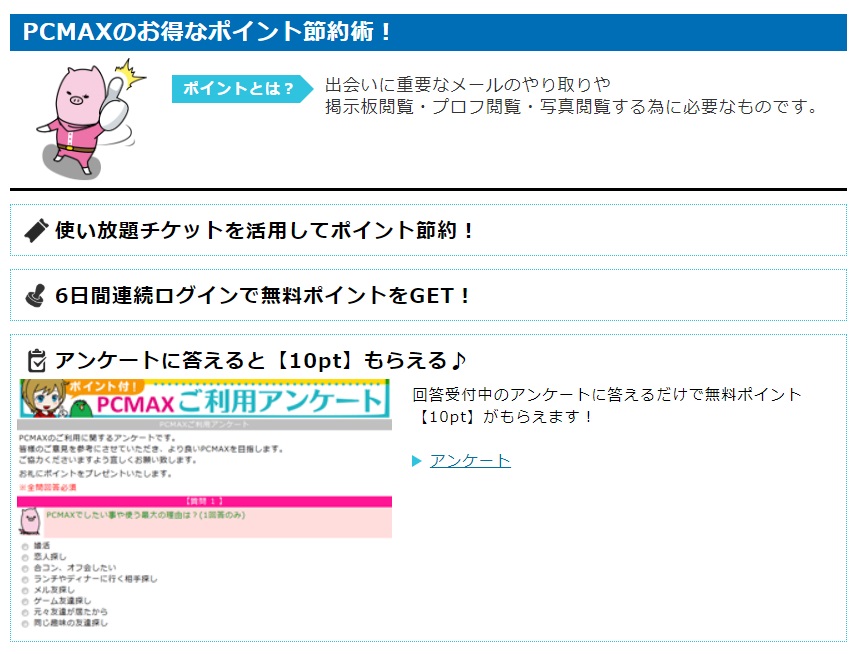 PCMAXはポイント消費が激しい出会い系サイトなので、アンケートにはかならず答えておきましょう。