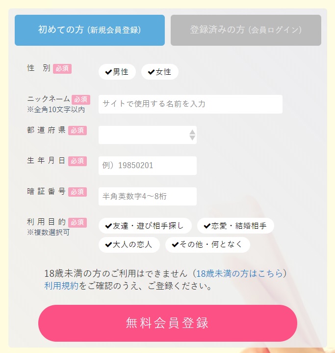 | ・利用目的に「恋人探し」「結婚相手」「H目的お断り」の記載があること もしくは望まない目的に「セックスフレンド」が入っている |