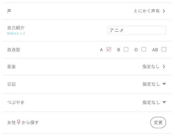 検索条件の設定次第では、声優の相手と出会える確率が高くなります。