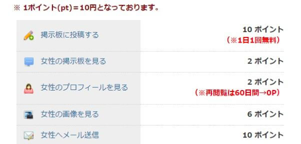 | 掲示板投稿 | 50P(1日1回無料) | プロフィール作成 | 無料 |