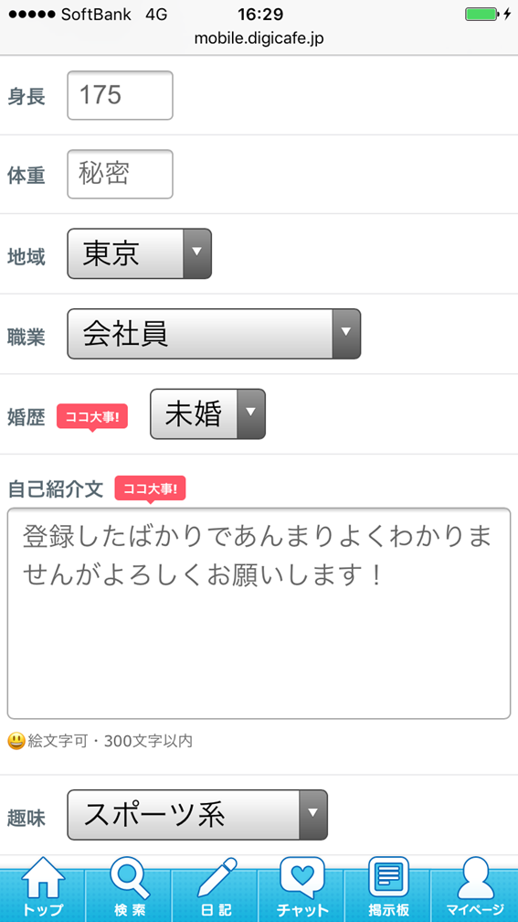 アダルティーな内容を入れると女性が完全に引いてしまうので、それは一切排除して爽やか系の雰囲気をアピールしてみました。
