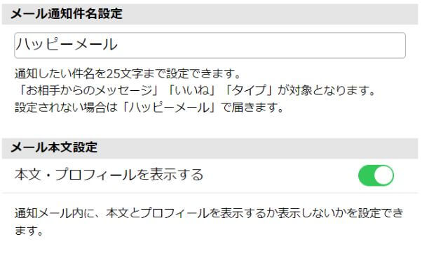 この機能を使えば、25文字の範囲でハッピーメールから届くお知らせ通知を任意の件名に変更できます。