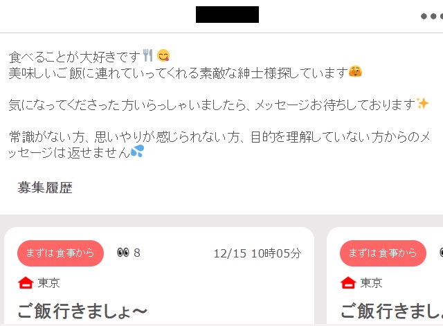 ピュア掲示板上では「友人にドタキャンされた」と書いてありますが、プロフィールの募集履歴をみると頻繁に食事相手を募集していることが分かります。