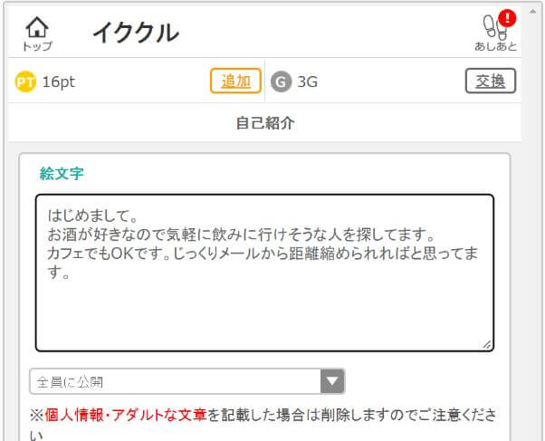 イククルで熟女と出会うには、簡単で良いので自己紹介を設定しておきましょう。面倒がってプロフィールの自己紹介を設定していないと、なんて返信すれば良いのかが分からず、返信率が下がるためです。