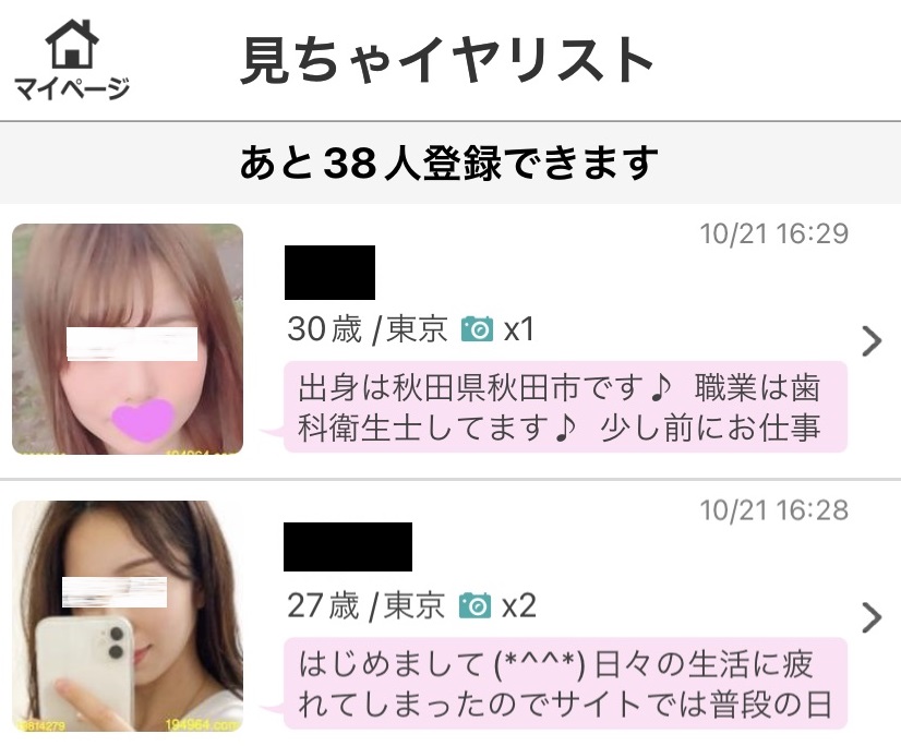 見ちゃイヤリストに登録済みの女性を一覧表示させるには、マイページ内の見ちゃイヤボタンを押します。