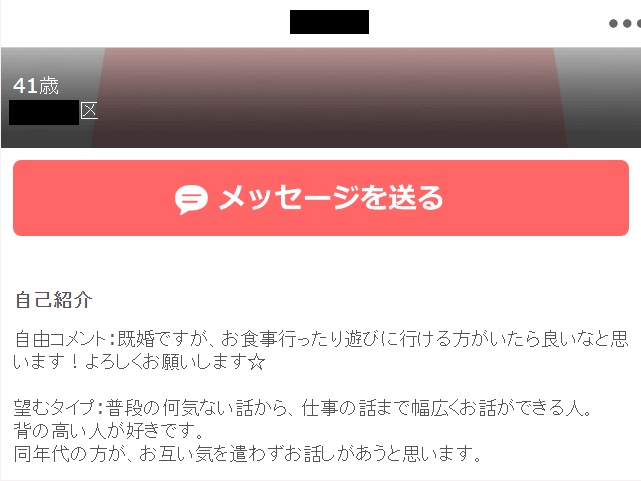 私から「良かったら色々とお話しませんか?仲良くなれたらお食事でも」と送ったところ、「既婚ですが、ぜひ仲良くしてください」と返事が。