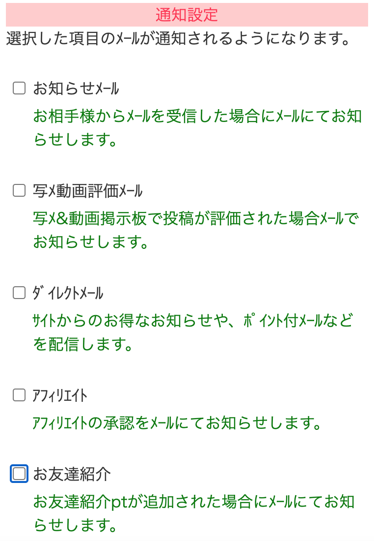 | 男性 | 《1pt=10円》 ・メッセージの投稿に5pt ・掲示板を見るのに1-3pt ・メッセージ返信するのに7pt ・画像閲覧3pt ・動画閲覧5pt ・プロフィールの閲覧1pt |