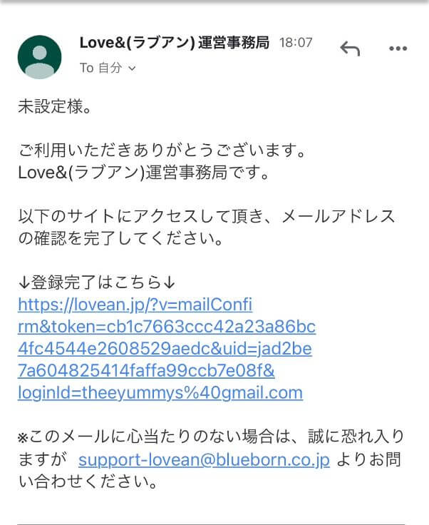 プロフィール登録の流れの中で入力したメールアドレス宛てに、ラブアンから以下のようなメールが届きます。