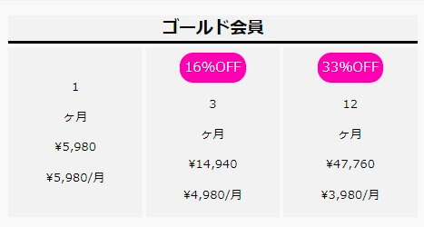 | 1ヶ月 | 5,980円/月 | 12,000円/月 | 8,000円/月 | 10,800円/月 |