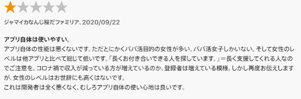 「とにかくパパ活目的の女性が多い。パパ活女子しかいない。そして女性のレベルは他アプリと比べて総じて低いです」