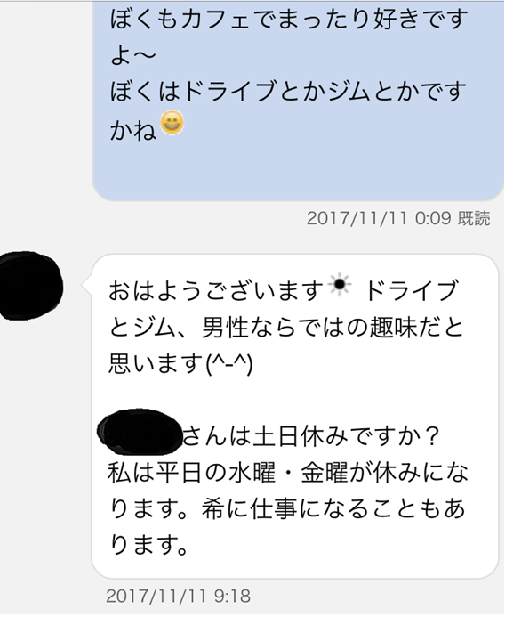 2人の女性と実際に会うまでやりとりした実感としては、だいたいサイト内のやりとりに2~3日、サイト外で2~3日、1週間後にデートするってパターンが一番スムーズにいくような気がしました。