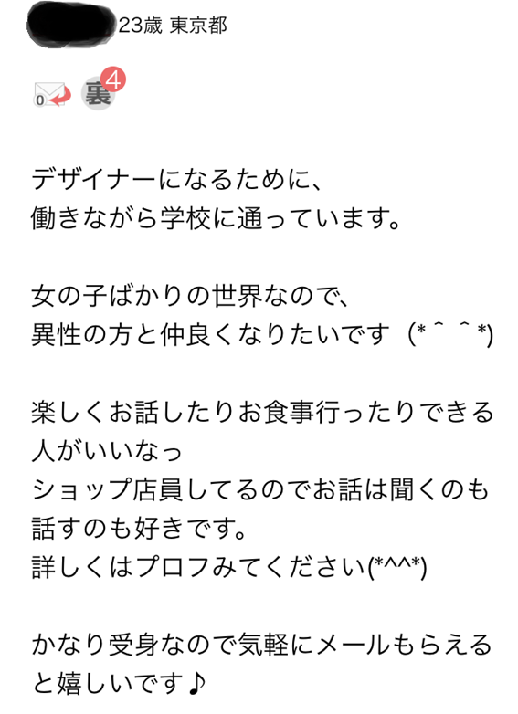 自己紹介文は画像ほど重要ではないものの、未記入だったり、マイナス印象を与えるような内容だとメッセージ交換をしてもらえない可能性が非常に高いです。