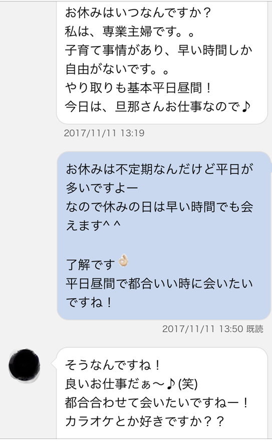 メールにも書いてある通り、この方は主婦で、旦那が居ない平日昼間に会える人を探しているようです。