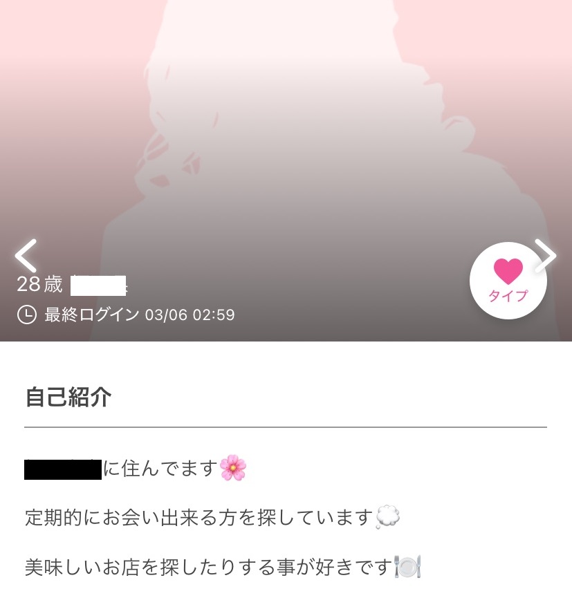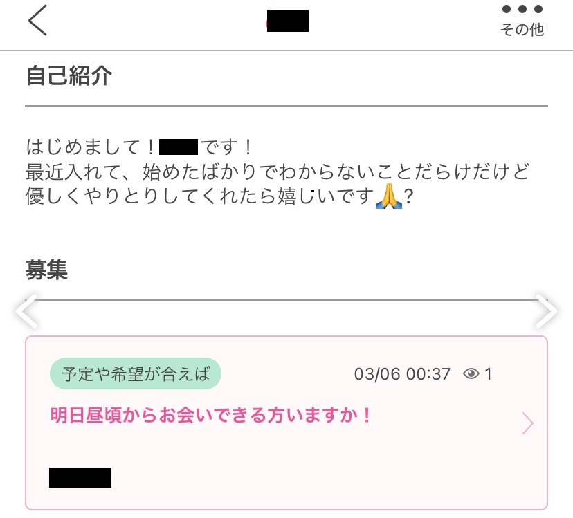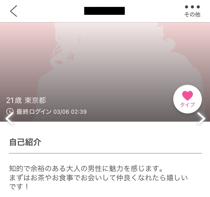 また、顏写真を載せていないことや、「会いましょーメッセージお断り」と自己紹介に書いていることから、業者やパパ活女子ではないはず。