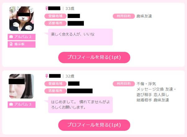 また、他の出会い系と違って“放置アカウント”が少ないのも魅力。掲示板や日記などの投稿機能で常にユーザーが動いているため、リアルタイムで出会いが発生しやすい環境が整っています。
