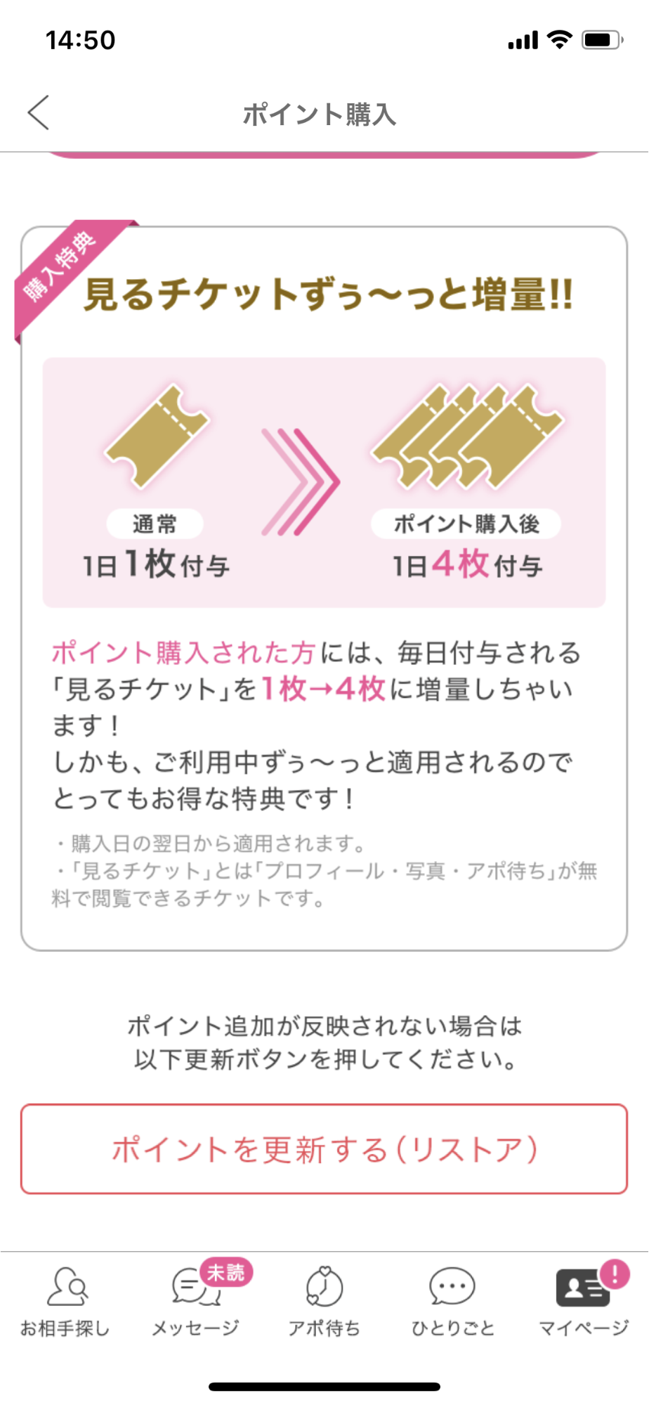 アプリ版から一度でも課金すると、ログインボーナスである「見るチケット」が1枚から4枚に増えます。