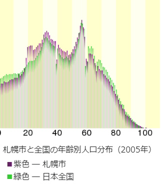 上の図は年齢別の人口分布を札幌市と全国平均で比べたもの。