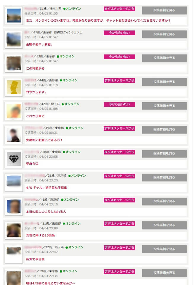 パパを探せる機能1つ目は掲示板。ただし、パパ活目的ではない男性が多いので、基本的には利用するのはおすすめしません。