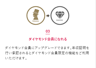 ダイヤモンド会員とは、「年収証明」を済ませた会員のことを指します。年収600万円以上で、前年度の源泉徴収票・確定申告書・納税証明書のどれかを提出して認証されることでダイヤモンドのマークが付きます。