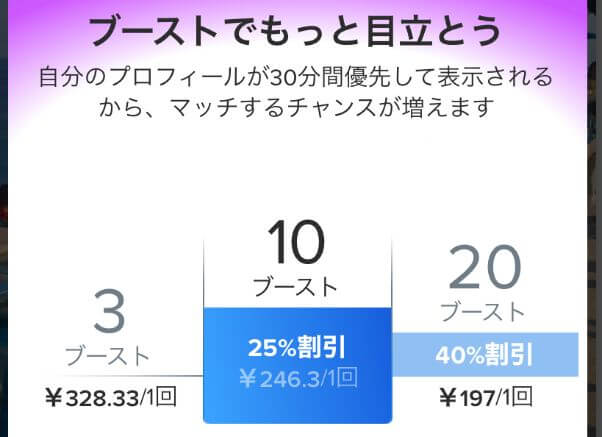 「ブースト」とは自分のプロフィールを相手のスワイプ画面に30分間優先表示させる機能です。