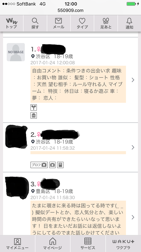 検索するとこのように女性の基本プロフが一覧になって表示されます。