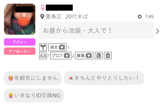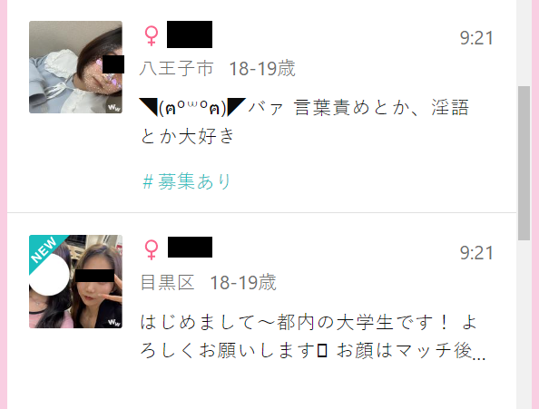 こちらの画像のように「今日、○○で会える方」や「△△時からお願いします」など、場所や時間だけを書いている女性は業者ではないと考えられます。