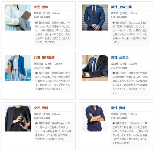 女性医師と士業・経営者・大企業エリート限定のマッチングサービスです。質の高い結婚相手を紹介することを目的としていて、忙しい時間の合間を使い手軽に婚活ができるようになっています。