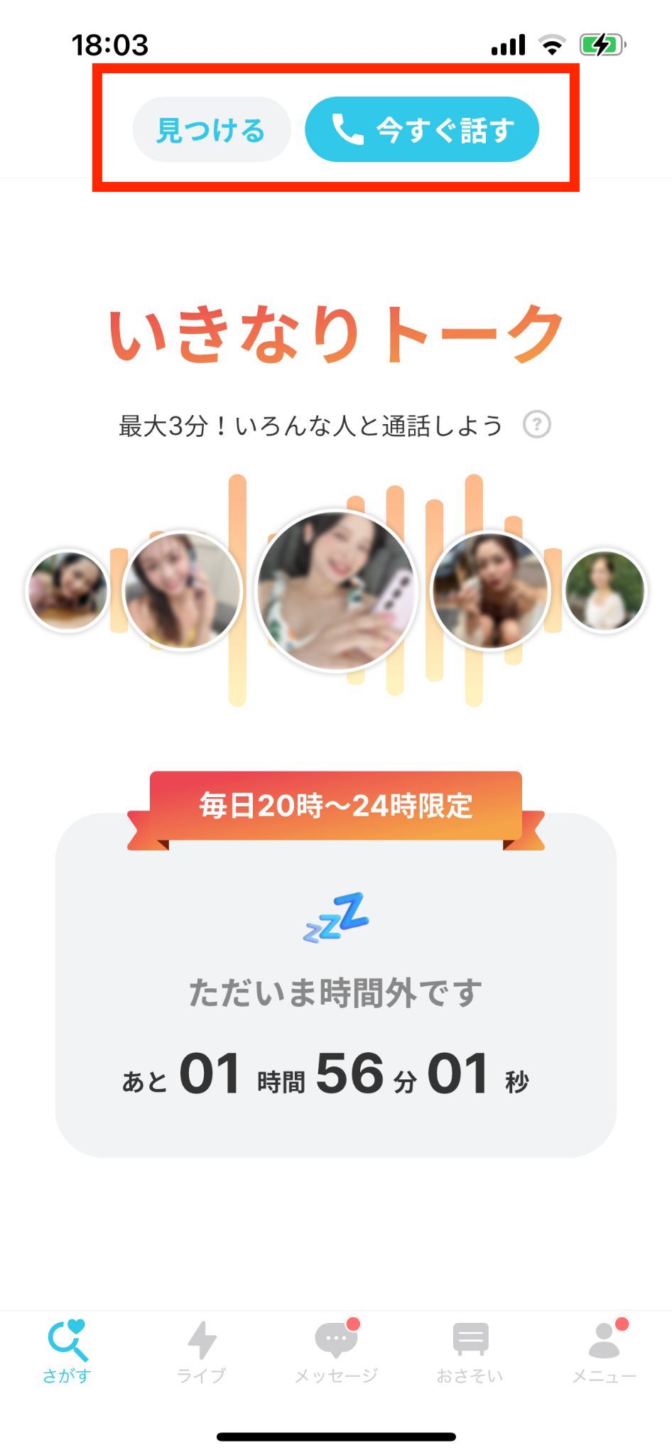 「いきなりトーク」は、ランダムでマッチングした異性と最大3分間の音声通話ができる機能です。