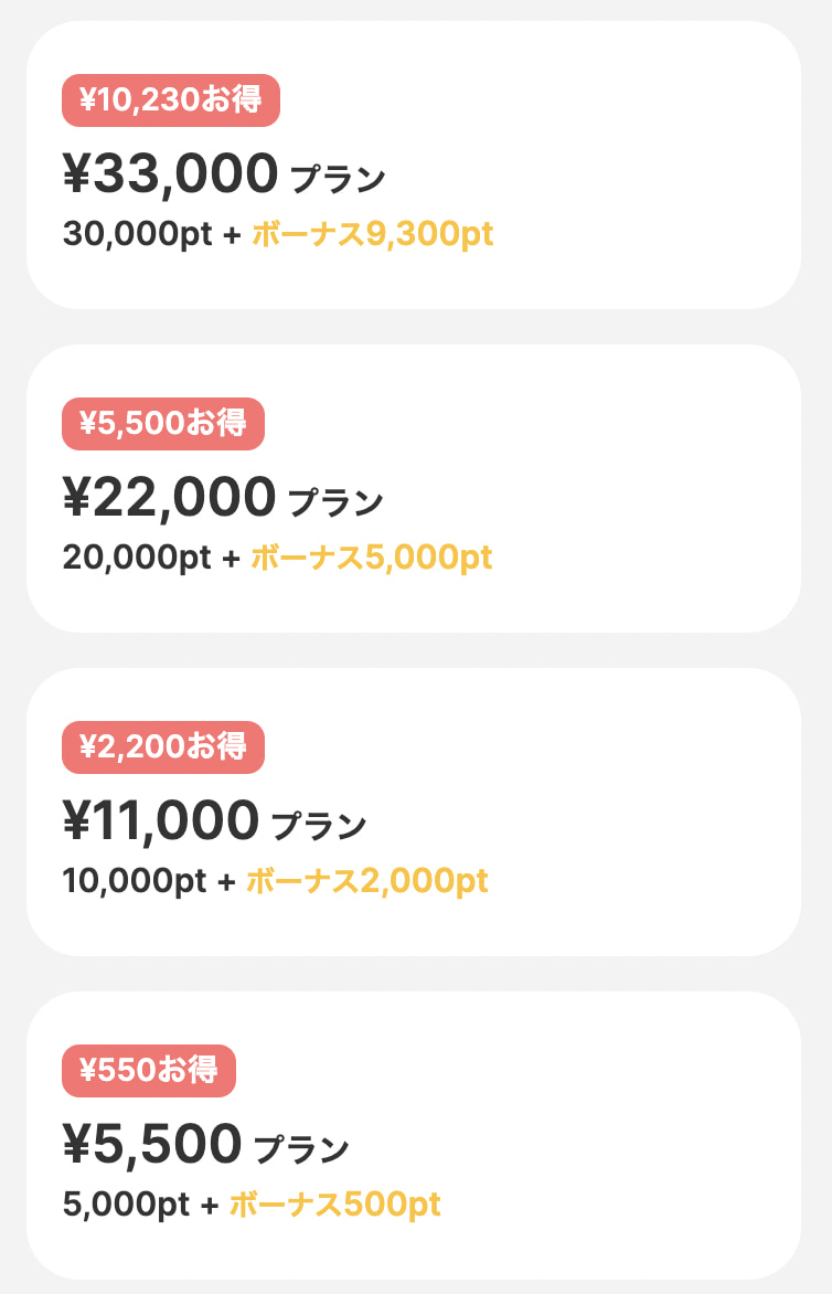 | 料金体系 | 1ポイント=1.08円 プロフィール閲覧 10ポイント メッセージ送信 50ポイント |